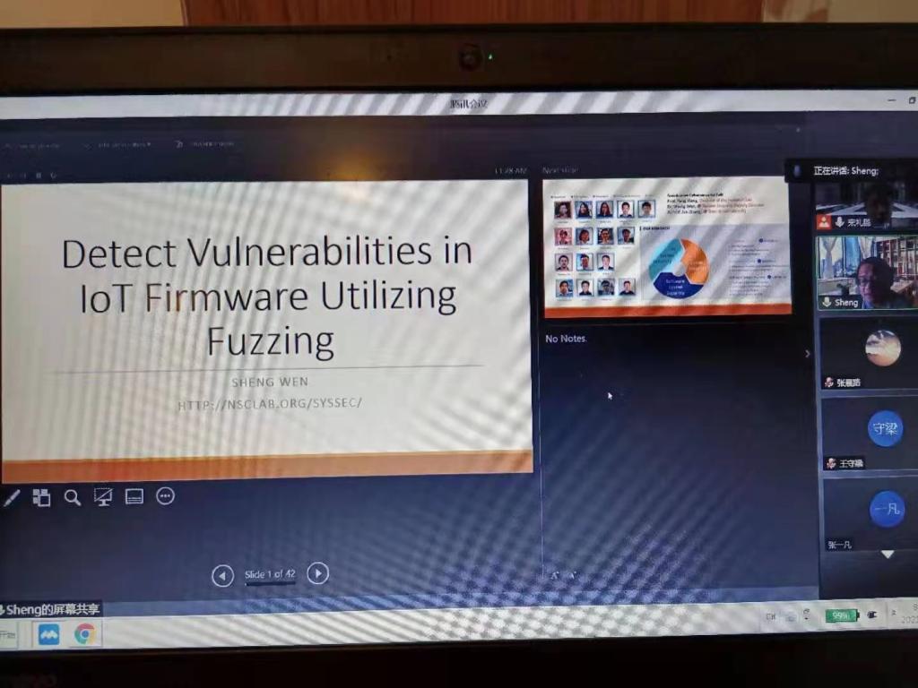 大数据与网络安全研究所师生做了题为“Blackbox Fuzzing of IoT Firmware via Message Snippet Inference”的学术报告。因疫情原因,本次报告采用线上方式进行。