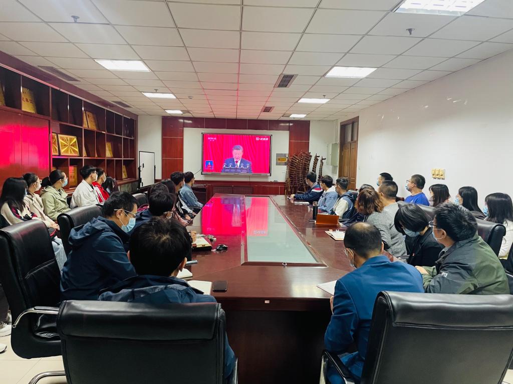 党委举行理论学习中心组扩大理论学习会议,组织领导班子成员、党员干部、师生群众代表在主楼919集中收看大会盛况,聆听习近平总书记代表第十九届中央委员会向党的二十大所作的报告。党员们佩戴闪亮党徽,现场悬挂国旗,气氛热烈而庄重。