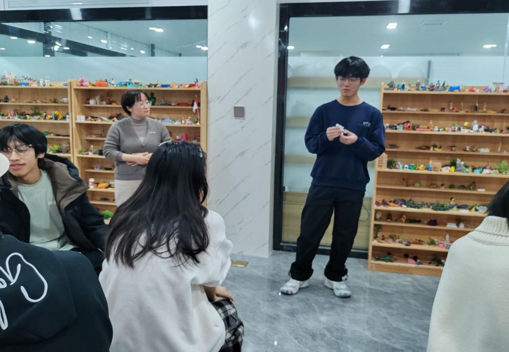 首先呢,老师让每个同学选择一个沙具来介绍自己,用沙具代替自己焦虑时的样子,通过一种生动有趣的方式介绍自己,同时也能够活跃现场的氛围。然后每个人都有两种选择,挪动别人的或者再选一次沙具,进行了五轮之后,每个小组的人的沙具都摆放成形,共同编出一个与主题相关的小故事。